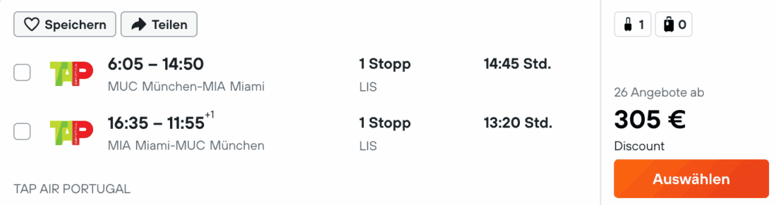TAP Portugal (Mitglied der Star Alliance) verkauft von verschiedenen deutschen Flughäfen aktuell wieder reduzierte Economy-Tickets zu mehreren Zielen in den USA. In diesem Zusammenhang erreicht ihr Miami, San Francisco oder Los Angeles schon ab 305€. Verfügbarkeiten gibt es für Reisen im Zeitraum von September 2025 bis März 2026.