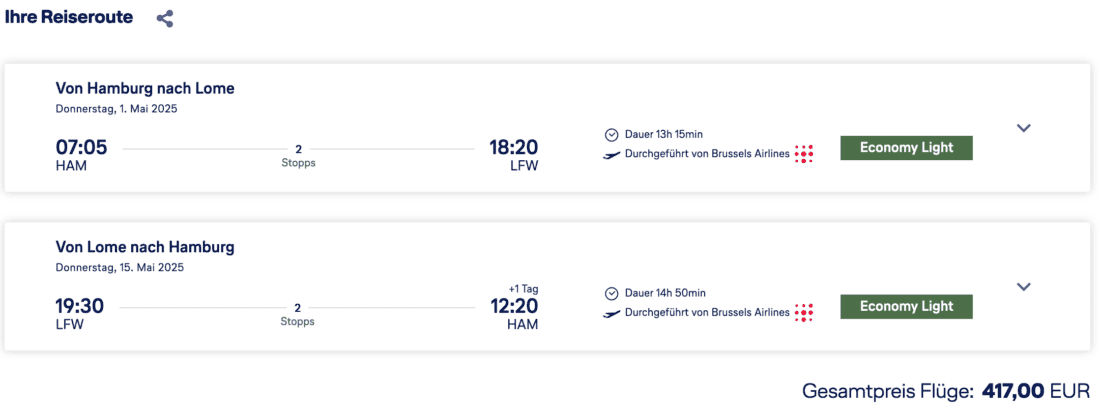 Brussels Airlines hat aktuell eine durchaus faire Offerte für Flüge von Deutschland nach Togo am Golf von Guinea in petto. Ihr erhaltet den Hin- und Rückflug von Hamburg, Berlin und weiteren Städten ab 417€. Verfügbarkeiten gibt es für Reisen im Zeitraum von Januar bis Juni sowie von September bis November 2025.