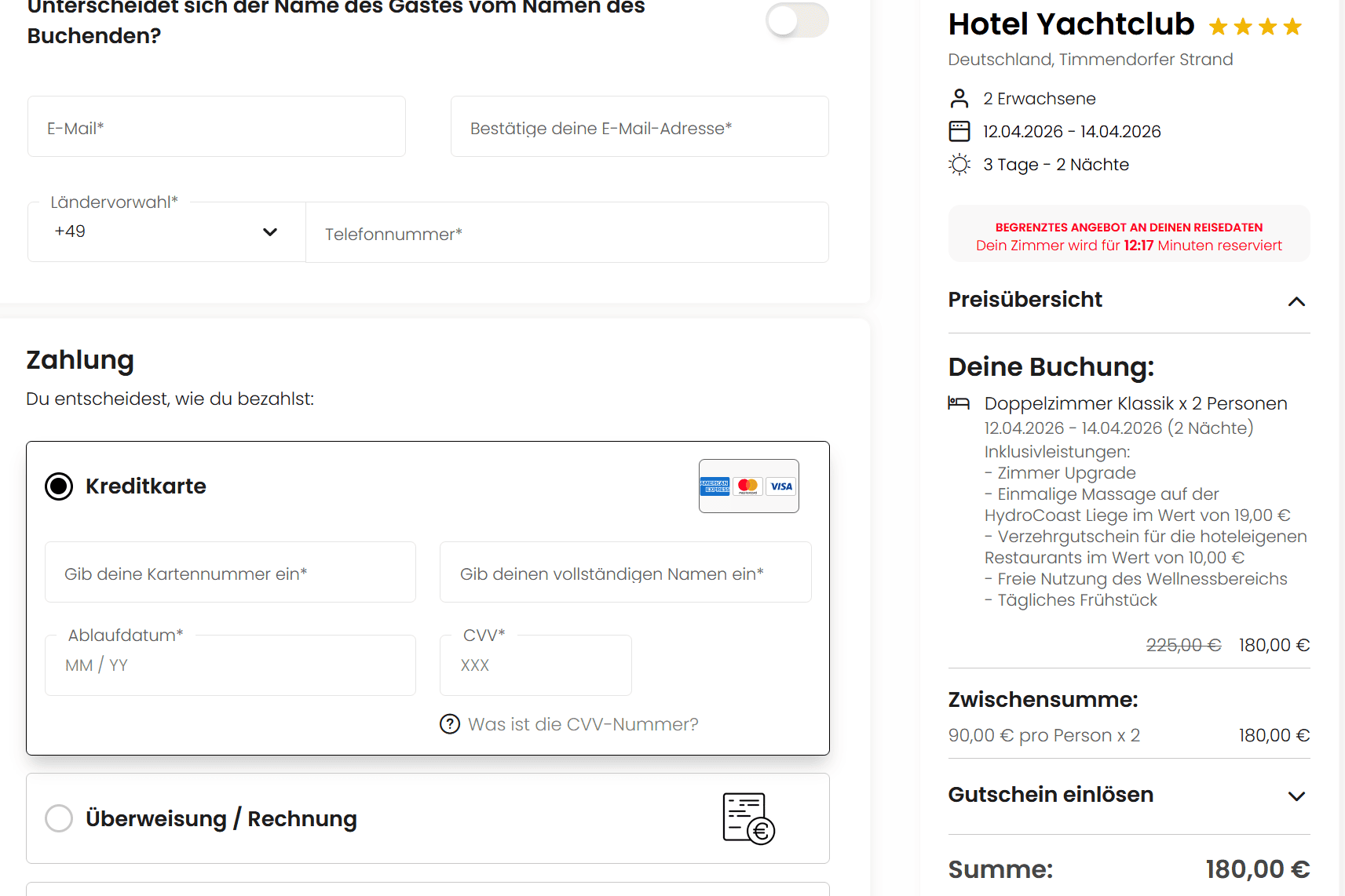 Bei Travelcircus habt ihr momentan die Möglichkeit, das Hotel Yachtclub am Timmendorfer Strand im Zeitraum bis April 2026 vergünstigt zu buchen. Eine Übernachtung im Premium Doppelzimmer gibt es im aktuellen Special bereits ab 90€ zzgl. Kurtaxe i.H.v. ca. 2€ pro Person und Nacht). Darin enthalten ist das Frühstücksbuffet und die Nutzung des Wellnessbereichs. On top gibt es noch 10€ Restaurantguthaben und eine Massage. Beachtet, dass ein Mindestaufenthalt von zwei Nächten gilt.