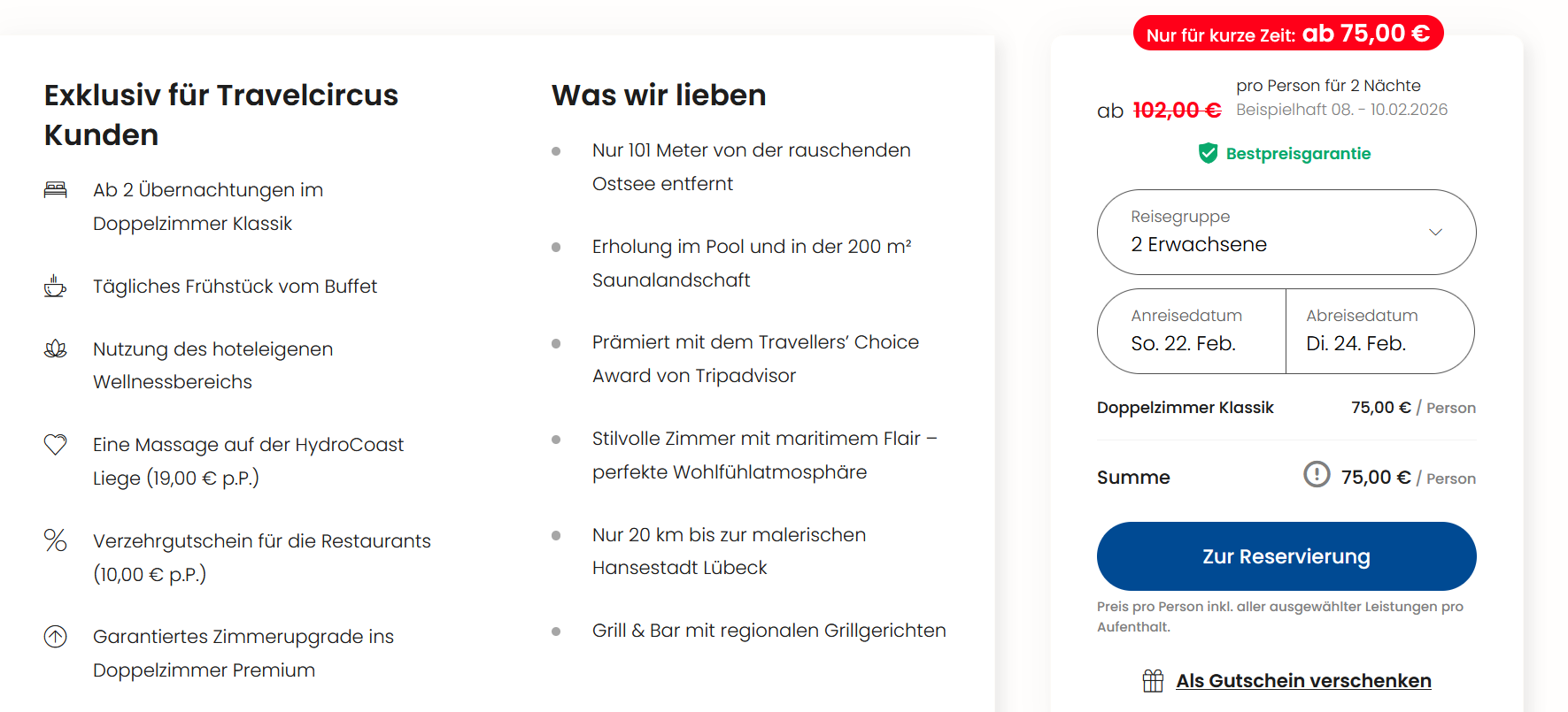 Bei Buchung über Travelcircus zahlt ihr im Beispiel 22. bis 24. Februar 150€ (zzgl. 8€ Kurtaxe):