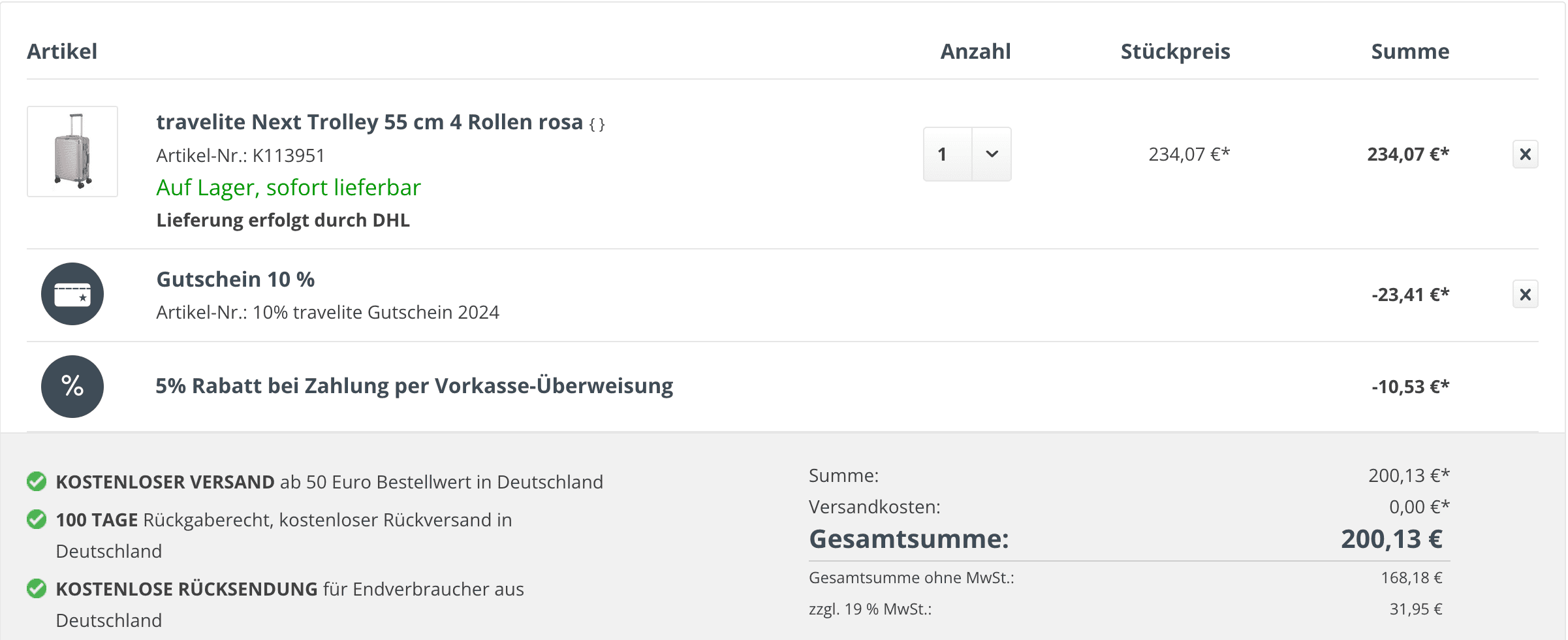 Travelite Next 77cm: 250€ – 24% = 228€ –> es müsste 300€ – 24% = 228% heißen.