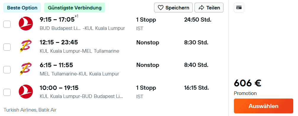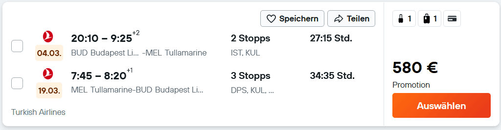 Neben den China-Eastern-Flügen ab Mailand gibt es gerade noch ein weiteres Angebot mit Flügen nach Australien. Mit Turkish Airlines und den Partner-Airlines Batik Air & Malaysia Airlines geht es ab 568€ von Budapest nach Melbourne und zurück. Im Titel haben wir 580€ angegeben, da es erst zu dem Preis halbwegs vernünftige Flugzeiten gibt.
