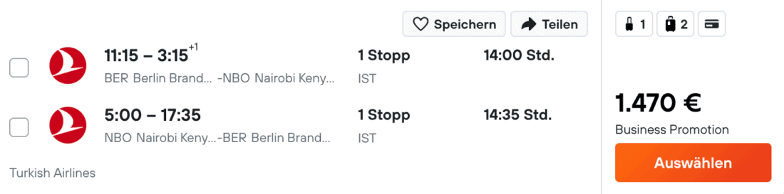Das Star Alliance-Mitglied Turkish Airlines verkauft aktuell relativ preiswerte Tickets in der Business Class nach Nairobi in Kenia. Der Abflug ist dabei von zahlreichen deutschen Flughäfen möglich. Den Hin- und Rückflug könnt ihr euch ab 1.470€ sichern. Günstige Tickets gibt es hauptsächlich im Zeitraum bis Februar 2025. Somit steht euch eine große Zeitspanne zur Verfügung.