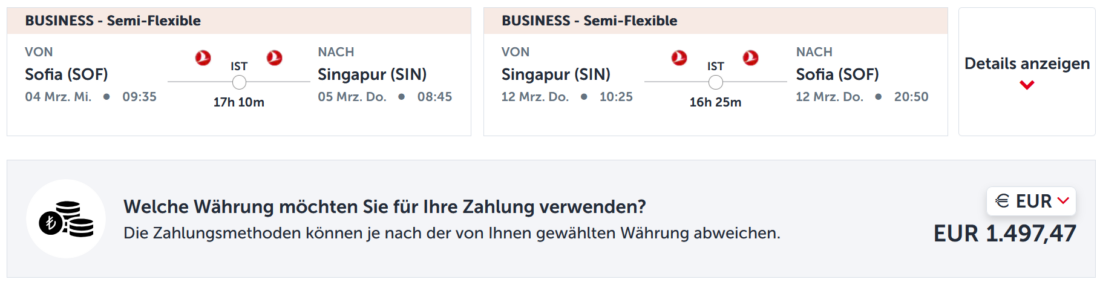 Eine Ausnahme gibt es jedoch. Der Preis für einen Hin- und Rückflug von Sofia nach Singapur sinkt durch Eingabe des Gutscheincodes FLYPRIME von sowieso schon günstigen 1.698€ auf nur noch 1.498€. Den Gutscheincode könnt ihr erst im letzten Schritt, nach Auswahl der Zahlungsmethode hinzufügen.