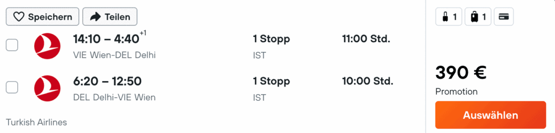 Das Star-Alliance-Mitglied Turkish Airlines bietet aktuell Tickets für Flüge von Wien nach Indien vergünstigt an. Ihr erreicht Neu-Delhi ab 390€ und Aufgabegepäck in Höhe von 30 kg ist inklusive. Verfügbarkeiten gibt es primär für Reisen von April bis Juni 2025. Stopover in Istanbul sind erlaubt (buchbar dann ab 430€).
