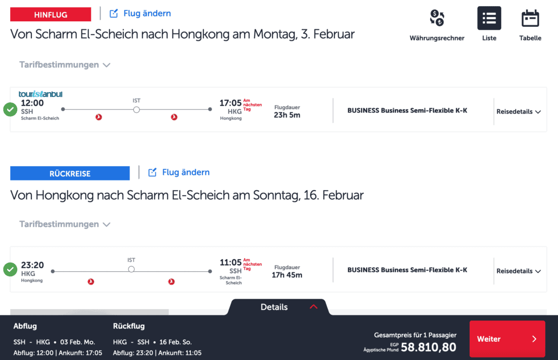 Momentan verkauft Turkish Airlines günstige Flüge in der Business Class vom ägyptischen Sharm El Sheikh nach Hongkong. Einen Hin- und Rückflug könnt ihr euch schon ab 58.811 EGP (~1.047 €) sichern. Verfügbarkeiten gibt es im Reisezeitraum von November 2024 bis März 2025. Im Preis inklusive sind 2x 32 kg Freigepäck sowie der Zugang zu den Lounges. Auf der Langstrecke von Istanbul nach Hongkong kommt ihr zudem in den Genuss von Lie-Flat-Sitzen.