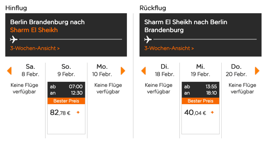 Für den Zubringer nach Sharm El Sheikh solltet ihr ab Deutschland in der Economy Class ca. 150 bis 200€ für den Hin- und Rückflug einplanen. Ein Beispiel für Nonstop-Flüge ab Deutschland ist die Verbindung mit Easyjet von Berlin, die ihr für Reisen im Februar 2025 ab 123€ (zzgl. Gebühren für großes Handgepäck und/oder Aufgabegepäck) buchen könnt. Weitere Optionen könnt ihr über Google Flights finden.