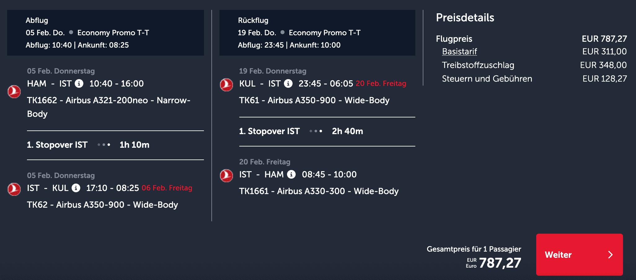 Oben seht ihr beispielhaft die Preise für einen Hin- und Rückflug nach Kuala Lumpur – links mit und rechts ohne Studierendenrabatt. Hier gibt es knapp 15% Rabatt auf den reinen Basistarif. Durch den hohen Treibstoffzuschlag liegt die Ersparnis letztlich aber insgesamt nur bei ca. 6%.