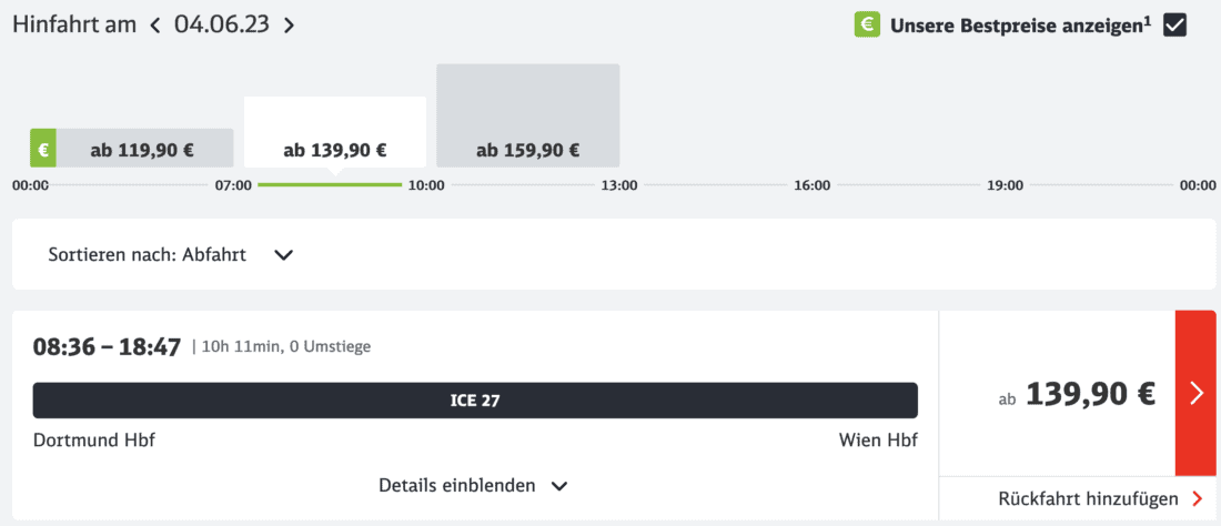 Möchtet ihr zum Beispiel rund einen Monat nach Buchung (am 4. Juni 2023) von Dortmund nach Wien fahren, so zahlt ihr bei der Deutschen Bahn mindestens 119,90€ für direkte Verbindungen: