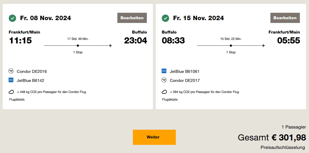 Von Frankfurt aus verkauft Condor gerade Tickets zu mehreren Zielen an der US-Ostküste ab nur 302€ inklusive 23 kg Gepäck. Am günstigsten sind dabei die Flüge nach Syracuse, Rochester und Buffalo mit kurzem Jetblue-Anschlussflug. Nach New York City gibt es zwar den Light-Tarif ab 270€, der beinhaltet aber nur ein Personal Item. Mit Gepäck werden 370€ draus.