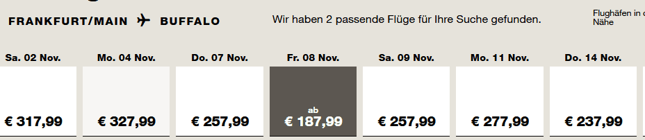 Wie lange das Angebot noch verfügbar ist, können wir euch nicht sagen. Die günstigen Preise sind nur für Reisen im November 2024. Die Preise hängen alle an ein paar dünnen Verfügbarkeiten auf der Strecke Frankfurt – New York am 8. und 9. November 2024. Immerhin gibt es dort aber bis zu 9 günstige Plätze pro Flug.