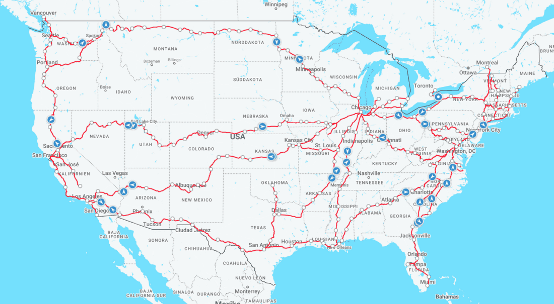 Alle aktuellen Bahnstrecken von Amtrak seht ihr in der folgender Karte. Auf Amtrak.com könnt ihr auch live verfolgen, wo sich die Züge gerade befinden: