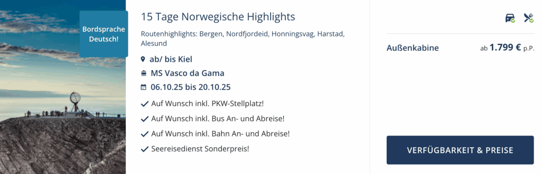 Die Vasco da Gama startet Anfang Oktober 2025 von Kiel auf eine 15-tägige Norwegen Kreuzfahrt. Aktuell kostet diese beim Seereisedienst 1.799€ pro Person in einer Außenkabine. Die weiteren Kategorien sind aktuell bereits ausgebucht. Vollpension ist inklusive, ebenso die An- und Abreise per Bus oder Bahn. Für Alleinreisende gilt das Angebot nicht.