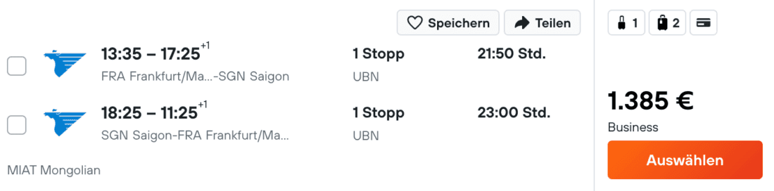 MIAT bietet momentan preiswerte Tickets für Business Class Flüge nach Vietnam an. Mit Abflug von Frankfurt erreicht ihr Ho-Chi-Minh-Stadt ab 1.385€. Verfügbarkeiten gibt es für Abflüge im Februar und März 2025. Hin- und Rückflug erfolgen via Ulaanbaatar und meist seid ihr im Boeing 787 Dreamliner unterwegs.