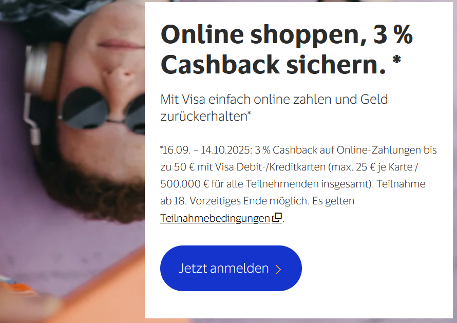 Visa hat heute wieder eine Cashback-Aktion aufgelegt. Als Inhaber einer deutschen Debit- oder Kreditkarte von Visa könnt ihr diesmal sogar 3% Cashback auf Onlinezahlungen erhalten (die letzten Aktionen gaben nur 2%). Dabei gelten aber wie üblich zwei wichtige Einschränkungen: