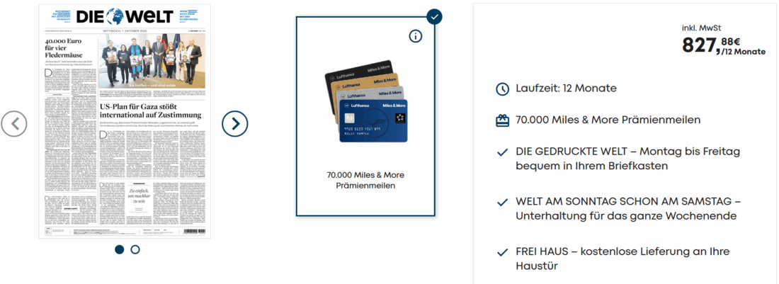Derzeit gibt es bei Miles&More wieder eine ordentliche Menge an Meilen für den Abschluss eines Zeitschriften-Abonnements. Für ein WELT Markenabo (enthält WELT, WELT am Sonntag & WELTplus Premium) erhaltet ihr 70.000 Meilen gutgeschrieben.