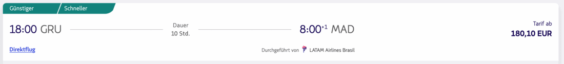 Die Tickets werden in Buchungsklasse A ausgestellt. Für den oben verlinkten Beispielflug von São Paulo nach Madrid könnt ihr dementsprechend voraussichtlich mit folgenden Meilengutschriften rechnen: