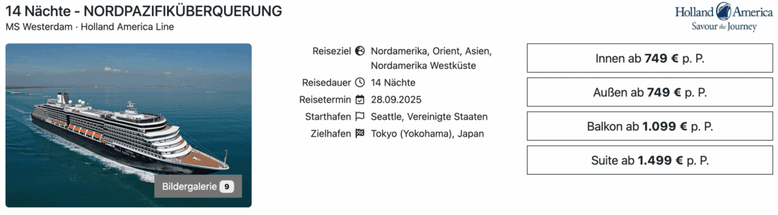 Aktuell könnt ihr eine günstige Positionierungskreuzfahrt mit der Westerdam von Seattle nach Yokohama buchen. Das Schiff gehört zur Flotte der Reederei Holland America Line und fährt Ende September 2025 innerhalb von 13 Nächten von der US-Westküste nach Japan. Auf dieser Pazifiküberquerung könnt ihr euch eine Außenkabine schon ab preiswerten 749€ pro Person sichern. Innenkabinen sind zum gleichen Preis verfügbar, für eine Balkonkabine werden 1.099€ pro Person fällig. Alleinreisende zahlen aktuell 1.260€ in einer Innen- oder Außenkabine.