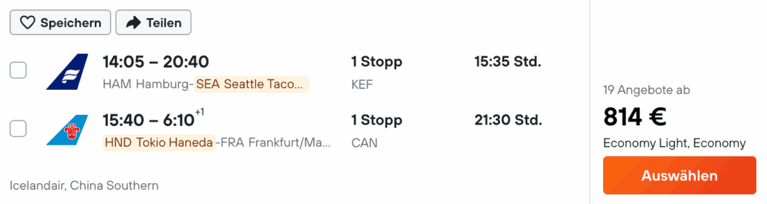 Die Kreuzfahrt startet in Seattle und endet in Yokohama (in der Nähe von Japan). Für die An- und Abreise sind daher Gabelflüge notwendig. Ein Beispiel sind Flüge mit Icelandair und China Southern. Bei Hinflug am 27. September und Rückflug am 13. Oktober 2025 könnt ihr diese Kombination momentan ab 814€ (zzgl. Aufgabegepäck bei Icelandair) buchen:
