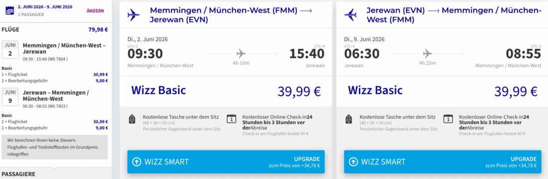 Nachfolgend findet ihr einige Beispieldaten für günstige Direktflüge von Memmingen nach Jerewan. Die angegebenen Preise gelten jeweils für den Tarif Wizz Basic sowie 20 kg Aufgabegepäck, welches ihr innerhalb des Buchungsprozesses hinzufügen könnt.