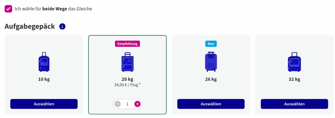 Der Basic-Tarif ohne jegliche Zusatzleistungen kostet übrigens insgesamt 80€ für den Hin- und Rückflug. Diese Option dürfte aber für die wenigsten von euch sinnvoll sein, da dieser Tarif lediglich einen persönlichen Gegenstand (z.B. Rucksack) mit den Maßen (40 x 30 x 20 cm) enthält.