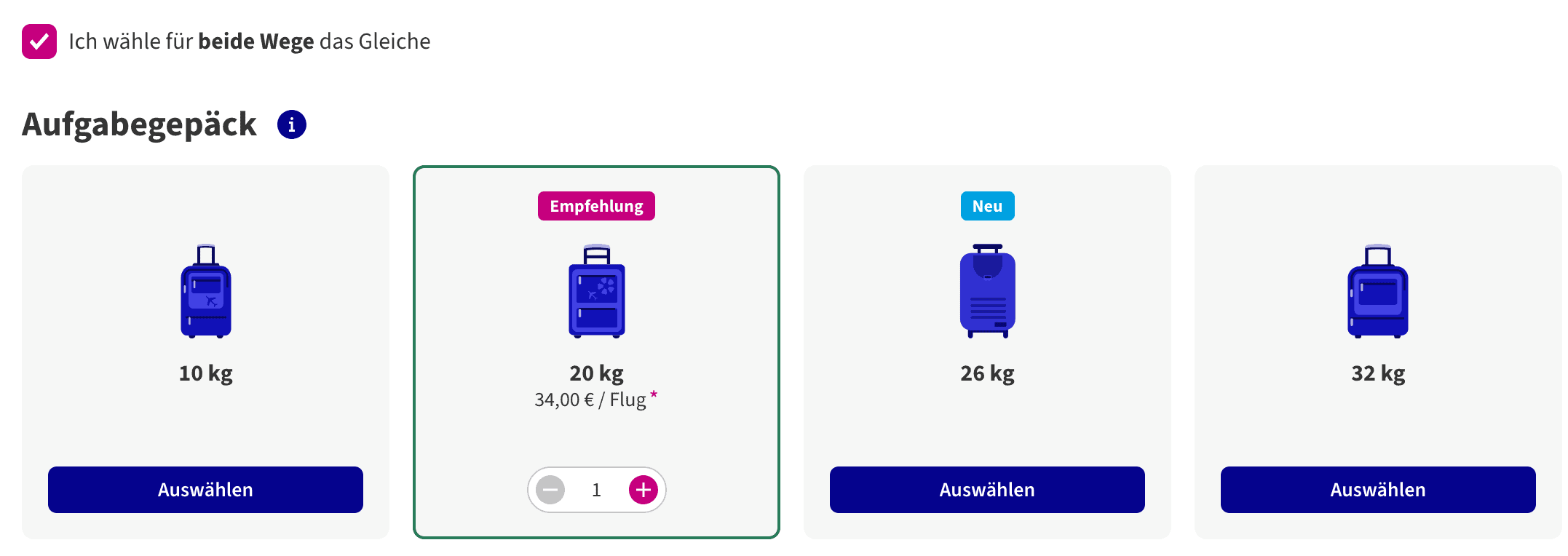 Um den günstigsten Preis inkl. Gepäck zu erhalten, wählt bitte zunächst die Tarifoption Wizz Basic aus. Im nächsten Schritt könnt ihr dann als Zusatzleistung das Aufgabegepäck hinzufügen. 20 kg sind – je nach Reisedatum – ab 34€ pro Strecke buchbar. Beachtet dabei, dass die Preise für Zusatzleistungen variabel sind und sich jederzeit ändern können. Wizz Air setzt dabei auf eine dynamische Preisgestaltung: