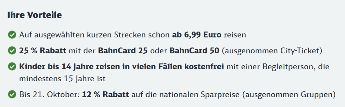 • Mit der BahnCard 25 / 50 gibt es zusätzlich die üblichen 25% Rabatt auf alle (Super) Sparpreise