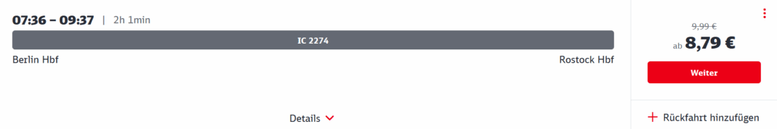 Die 2-Stunden-Fahrt von Berlin nach Rostock gibt es ab 8,79€ statt 9,99€ in der 2. Klasse: