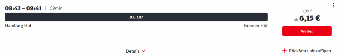 Und von Hamburg nach Bremen kommt ihr im ICE sogar ab 6,15€ mit recht guten Verfügbarkeiten: