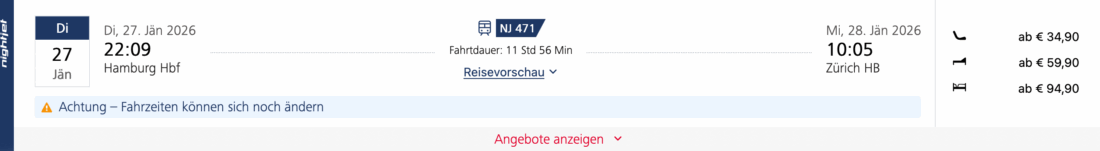 Fahrten in der 1. Klasse sind ebenfalls rabattiert. Buchen könnt ihr immer 12 Monate im Voraus, aktuell also bis Mitte Oktober 2026. Meist sind die Tickets günstiger, je länger im Voraus gebucht wird und können kurzfristig auch im dreistelligen Bereich liegen.