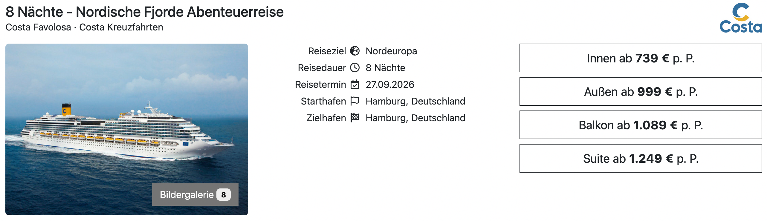 Für Alleinreisende ist diese Kreuzfahrt in einer Innenkabine ab 916€ buchbar. Die genannten Preise beinhalten die Vollpension im Haupt- und Buffetrestaurant sowie Kaffee und Tee zu den Hauptmahlzeiten.