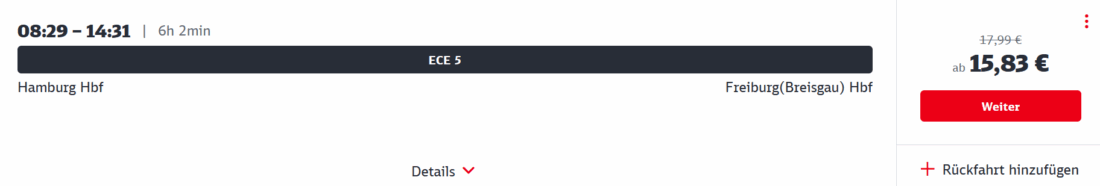 Beispielsweise könnt ihr im Februar für 15,83€ statt 17,99€ von Hamburg bis nach Freiburg fahren. In der 1. Klasse würde die günstigste Fahrt auf der Strecke 26,39€ kosten. Mit passender BahnCard werden jeweils noch 25% abgezogen: