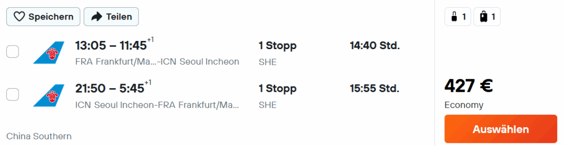 Passende Termine findet ihr schnell & einfach mithilfe von Google Flights (Anleitung). Buchen könnt ihr dann beispielsweise über Anbieter bei Kayak oder Skyscanner. Teilweise ist die Weiterleitung von Google Flights zu Lastminute.com sogar noch etwas günstiger. Direkt bei China Southern müsst ihr hingegen mit ca. 40€ Aufpreis rechnen.