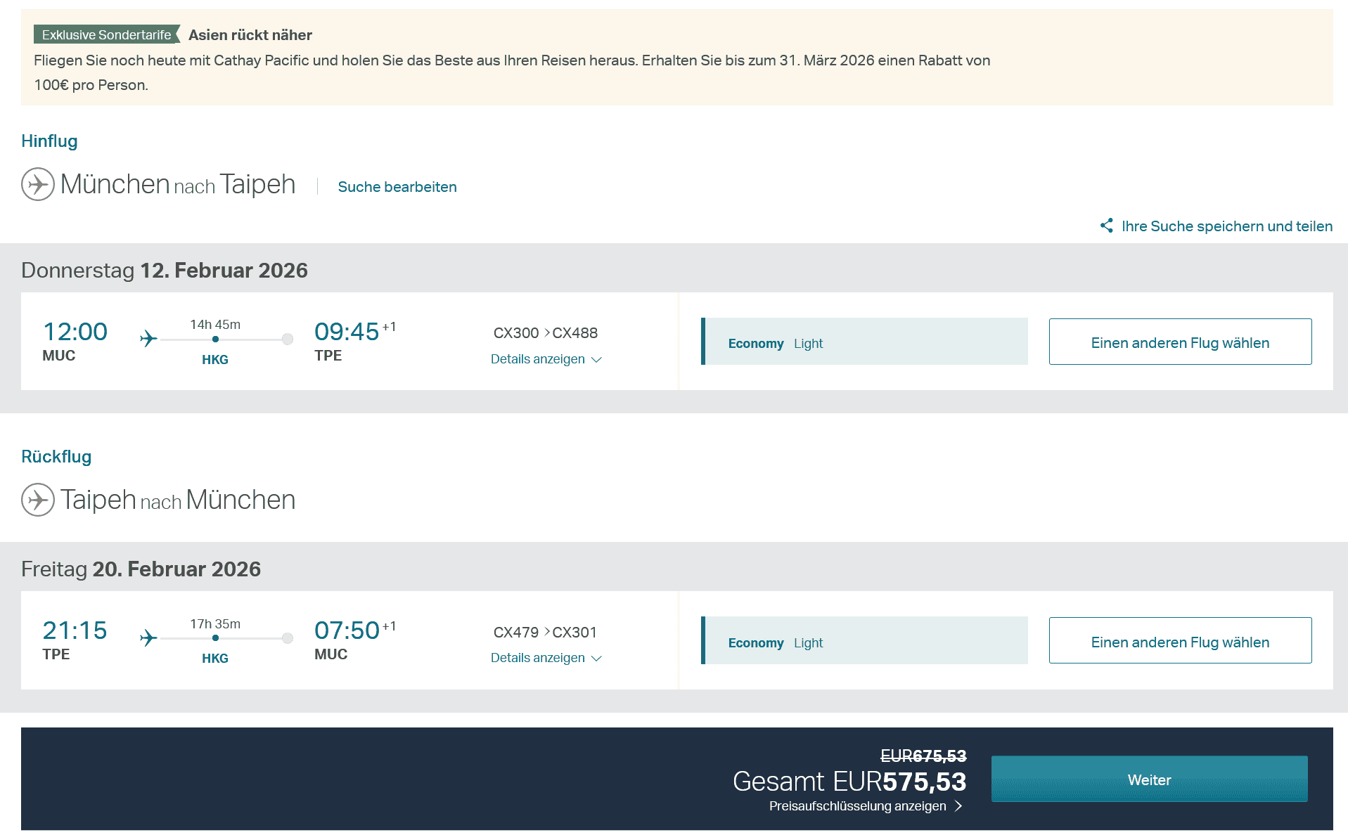 Mit dem Code könnt ihr beispielsweise Hin- und Rückflüge von München nach Taiwan für 576€ statt 676€ buchen (inkl. 23 kg Gepäck):