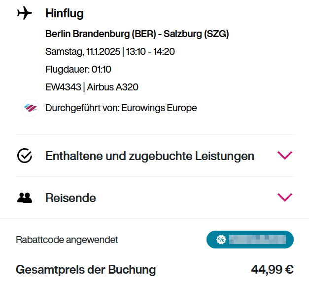 Nach längerer Zeit gibt es gerade mal wieder einen Rabattcode des Billigfliegers Eurowings. Damit erhaltet ihr 10% Rabatt auf alle Flüge zwischen Deutschland und Österreich. Der Flug muss allerdings im Januar 2025 stattfinden und darf nicht mehr als 80€ pro Richtung kosten.
