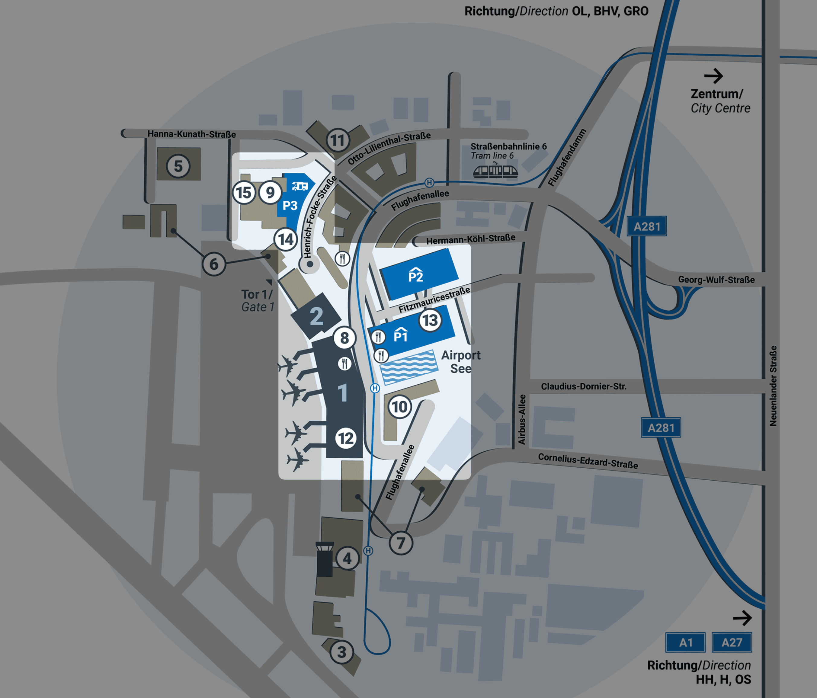 Der Flughafen Bremen verfügt über zwei Parkhäuser P1 (direkt am Terminal 1) und P2 (ca. 4 Minuten zu Fuß vom Termina sowie über einen Parkplatz P3.