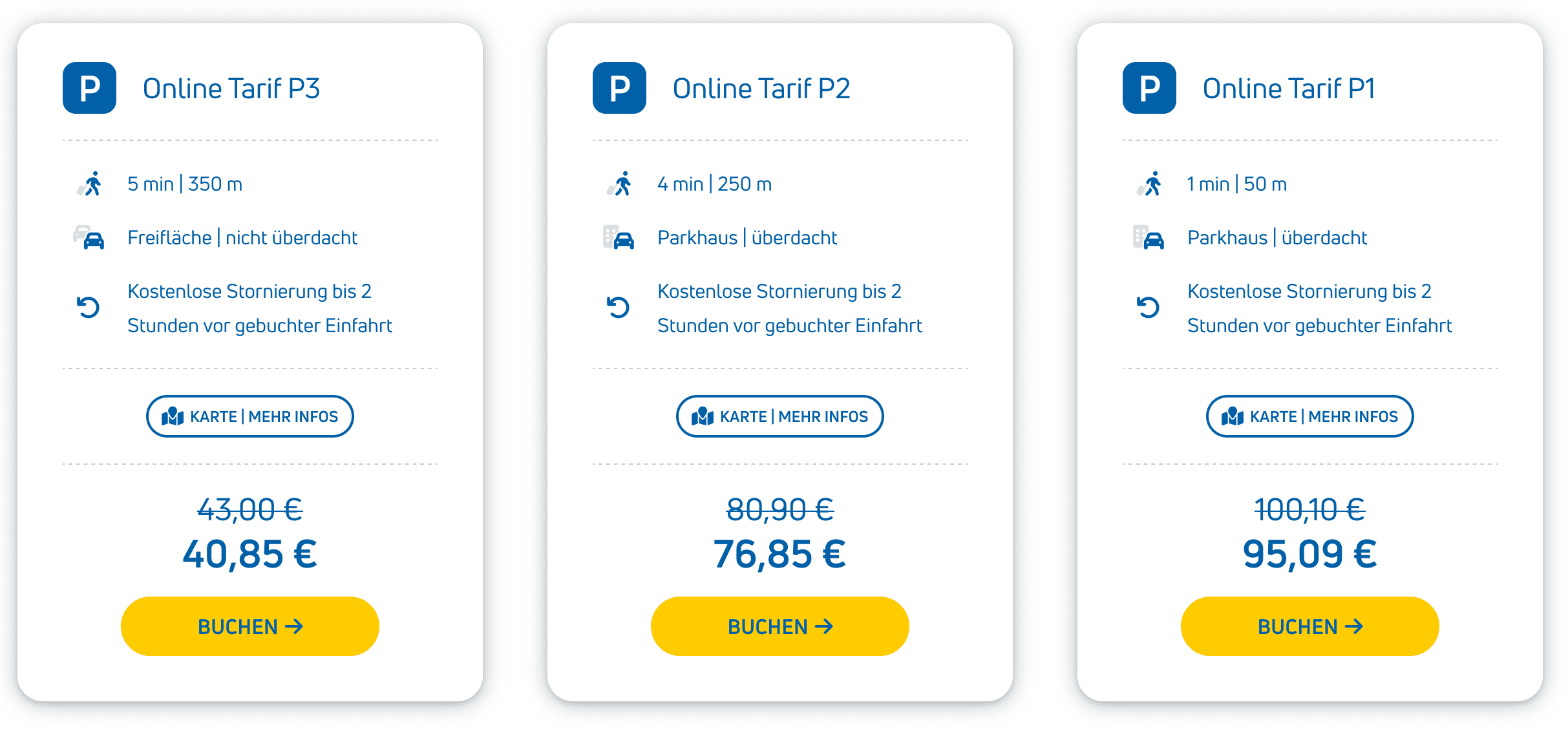Eine Woche auf dem Parkplatz P3 ist günstiger als 2 Tage im Parkhaus P1 oder P2. Es hindert euch natürlich niemand daran, den Parkplatz P3 für eine Woche zu buchen und niemand wird euch an der Ausfahrt hindern, wenn ihr nicht die vollen 7 Tage euer Auto abgestellt habt.