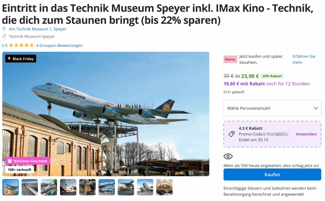Mit dem aktuellen Halloween-Deal bekommt ihr den Eintritt ins Technik Museum Speyer inkl. einer Vorstellung im IMAX DOME Kino für 19,60 € pro Person (Ü14). Der Normalpreis dafür direkt beim Museum liegt bei 25€ (Sonderangebot bis Dezember) bzw. 30€ für Januar. Groupon selbst verkauft den Gutschein für 23,90€.