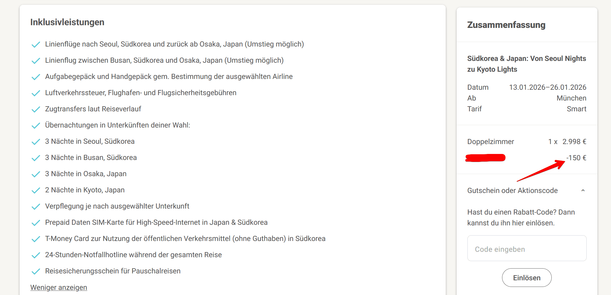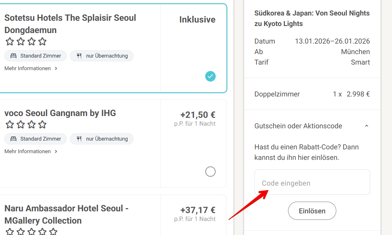 Einen Gutscheincode könnt ihr bei der Zusammenfassung der Reise eingeben: