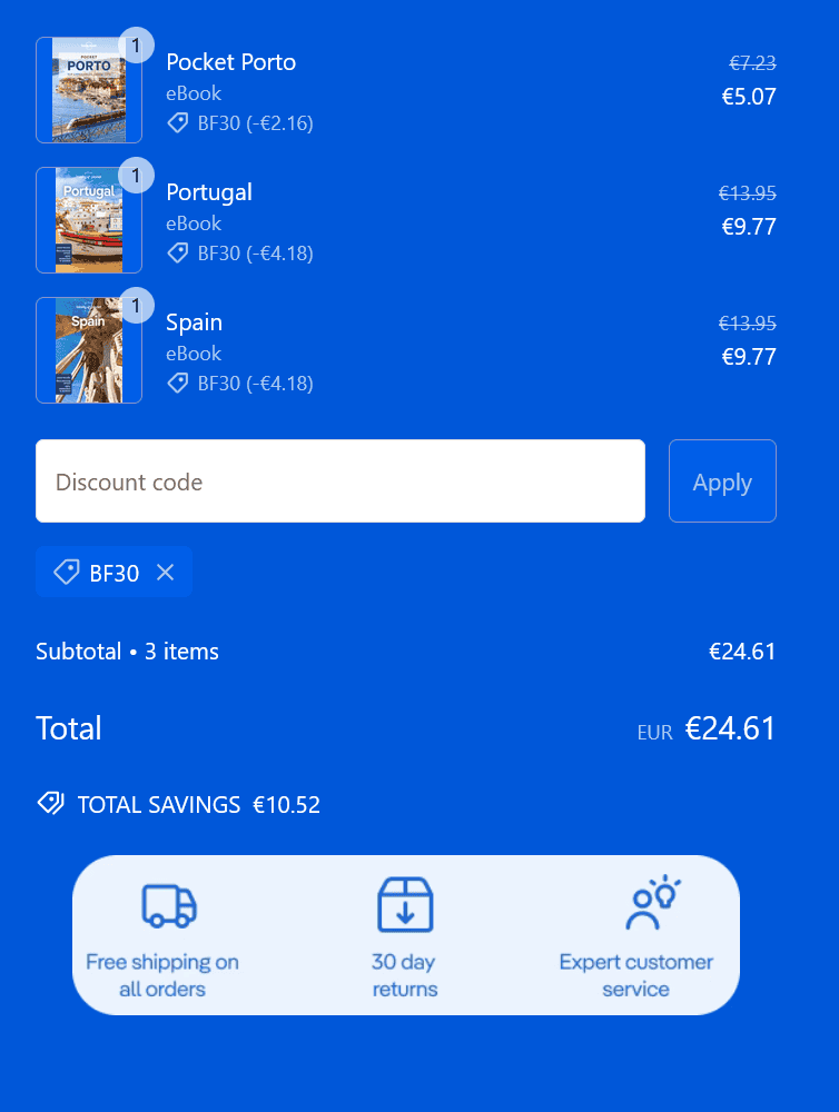 Habt ihr einen Gutscheincode erhalten, könnt ihr diesen einfach auf der Website von Lonely Planet einlösen. Sucht dazu zunächst die gewünschten Produkte aus, geht in den Warenkorb „Cart“ und klickt anschließend auf „Proceed to Checkout“. Hier habt ihr nun auf der rechten Seite die Möglichkeit, bei „Discount code“ den Gutscheincode einzugeben.