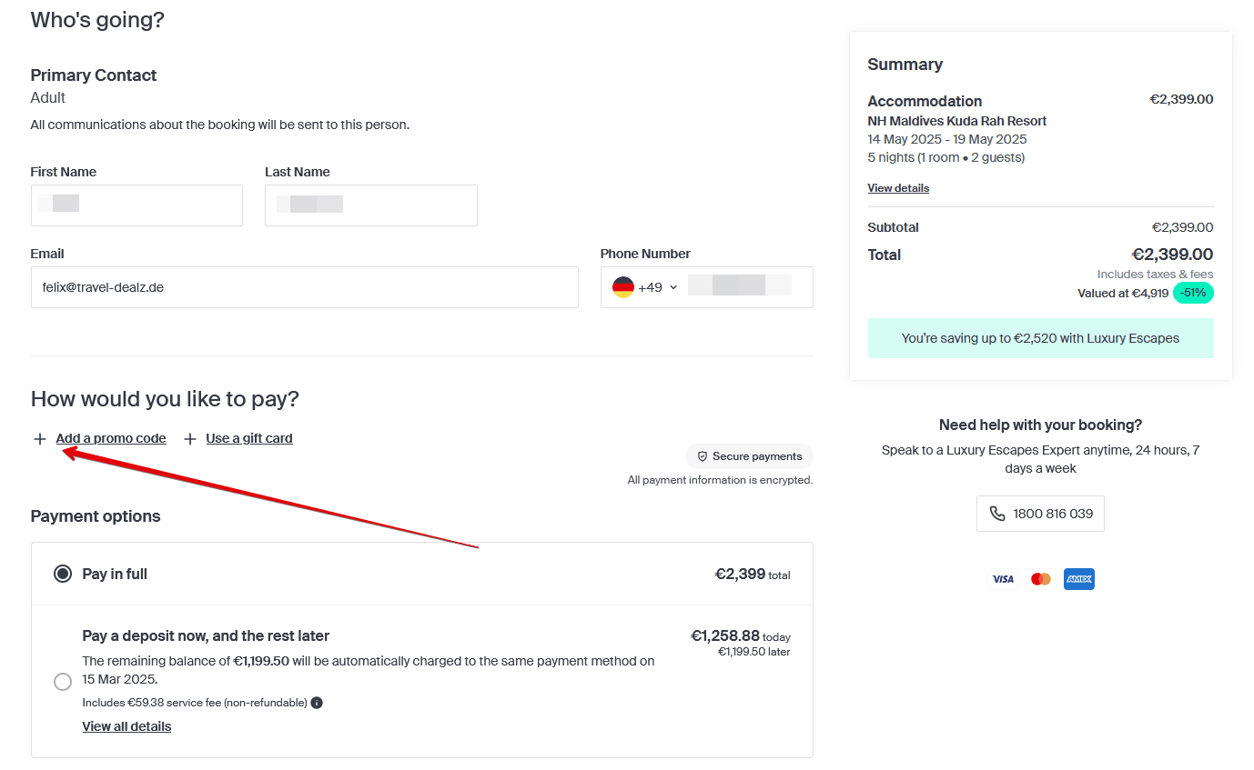 Um den Gutscheincode einzulösen, müsst ihr eines der Angebote auswählen und anschließend den Buchungsprozess fortsetzen, bis ihr auf der Zahlungsseite angekommen seid. Dort könnt ihr den Gutschein unterhalb der persönlichen Daten und oberhalb der Zahlungsinformationen eingeben: