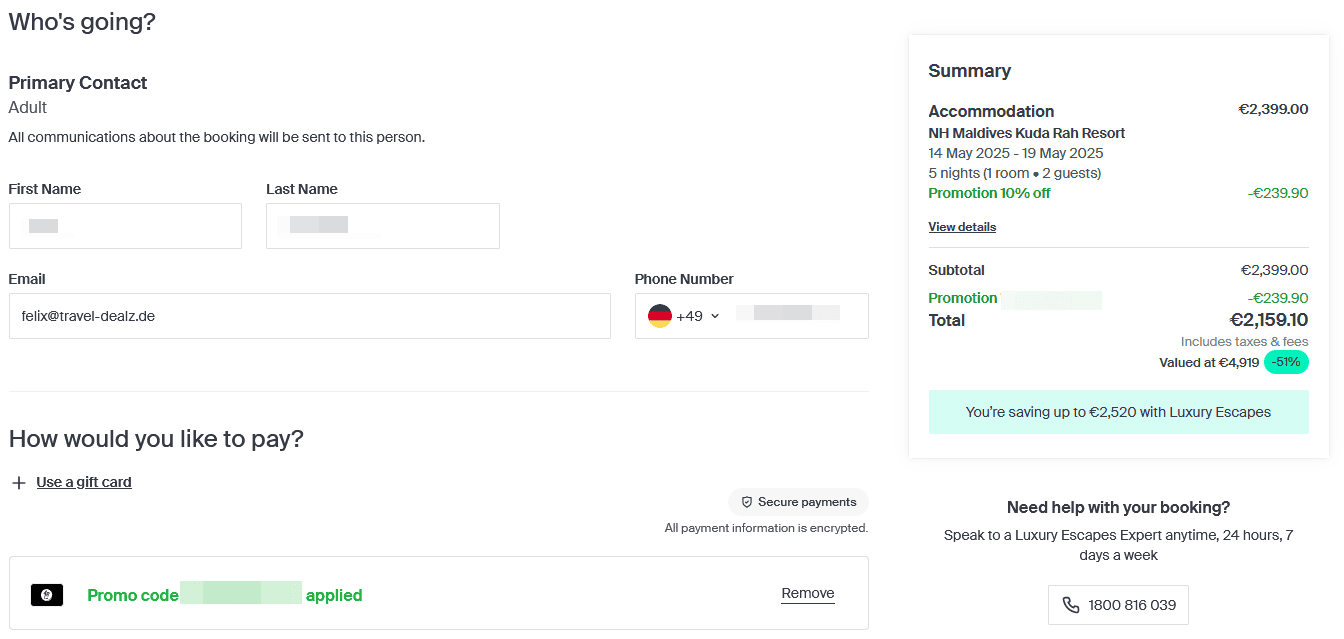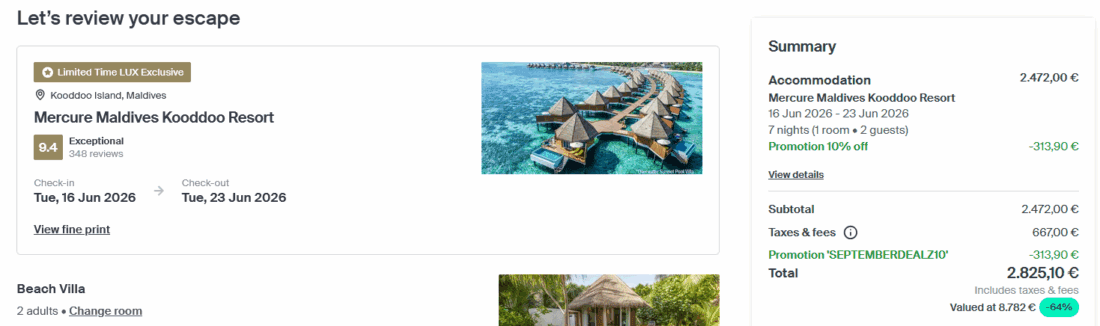 Bei Buchung bis zum 30. September 2025 könnt ihr sogar noch mehr sparen, denn LuxuryEscapes hat uns einen 10% Rabattcode zur Verfügung gestellt. Es gilt ein Mindestbuchungswert in Höhe von 200€: