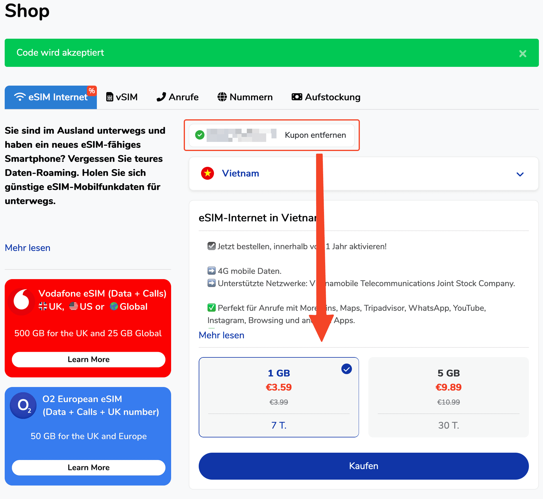 Einen Gutscheincode könnt ihr nach der Anmeldung unter dem Punkt Shop einlösen: