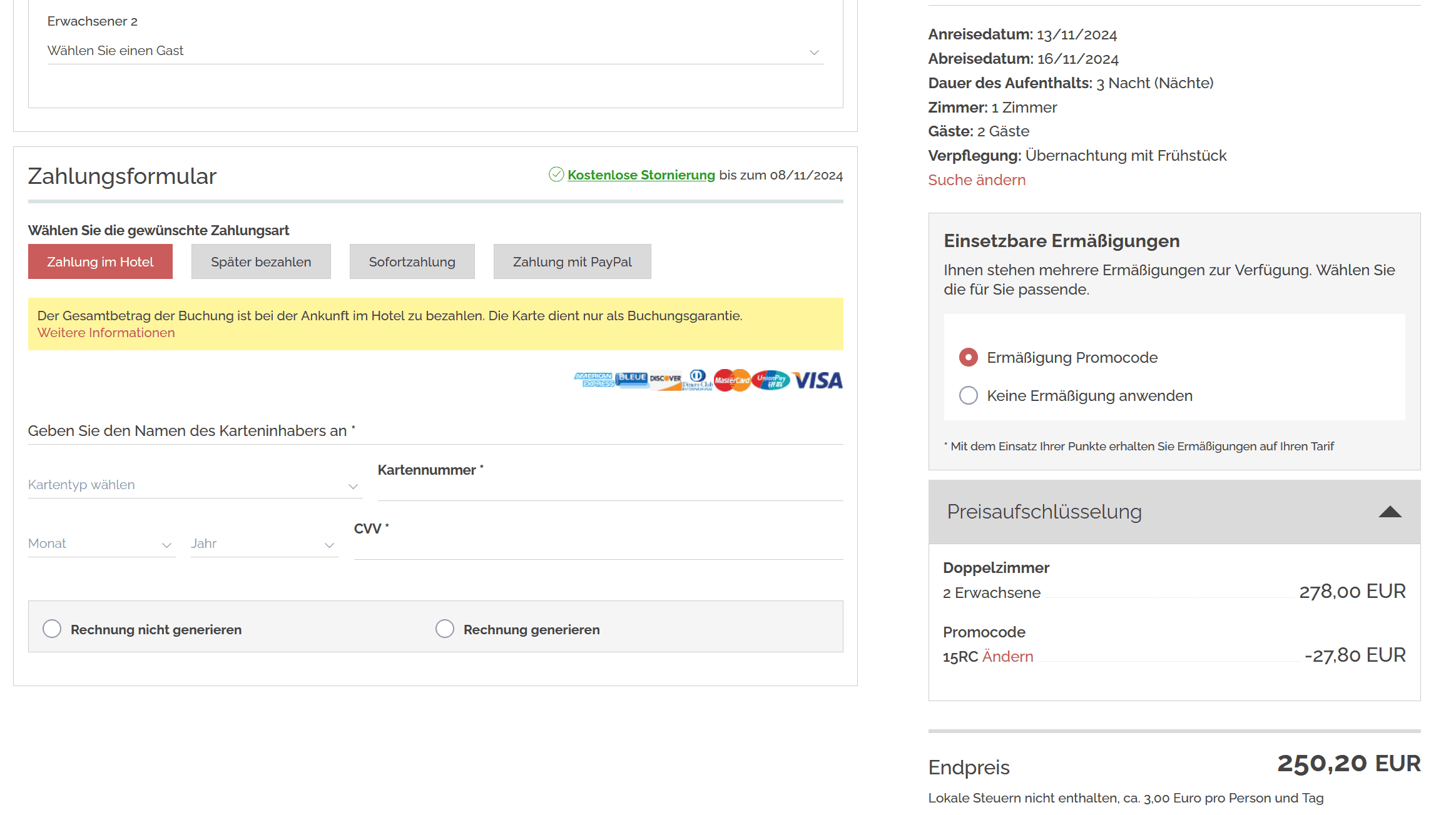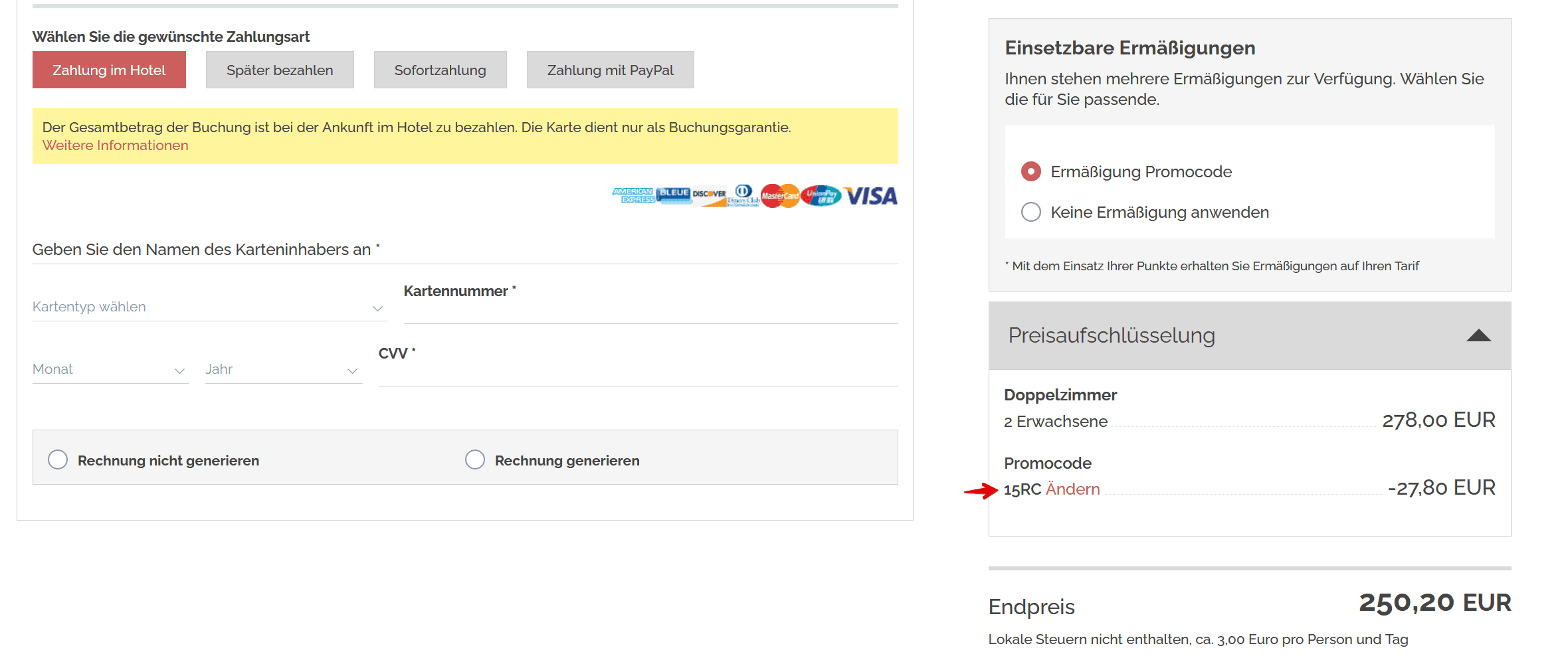 Der Gutschein wird überprüft und vom Endpreis abgezogen. Wie hoch der Rabatt ausfällt, hängt bei diesem Gutschein vom jeweiligen Hotel ab.