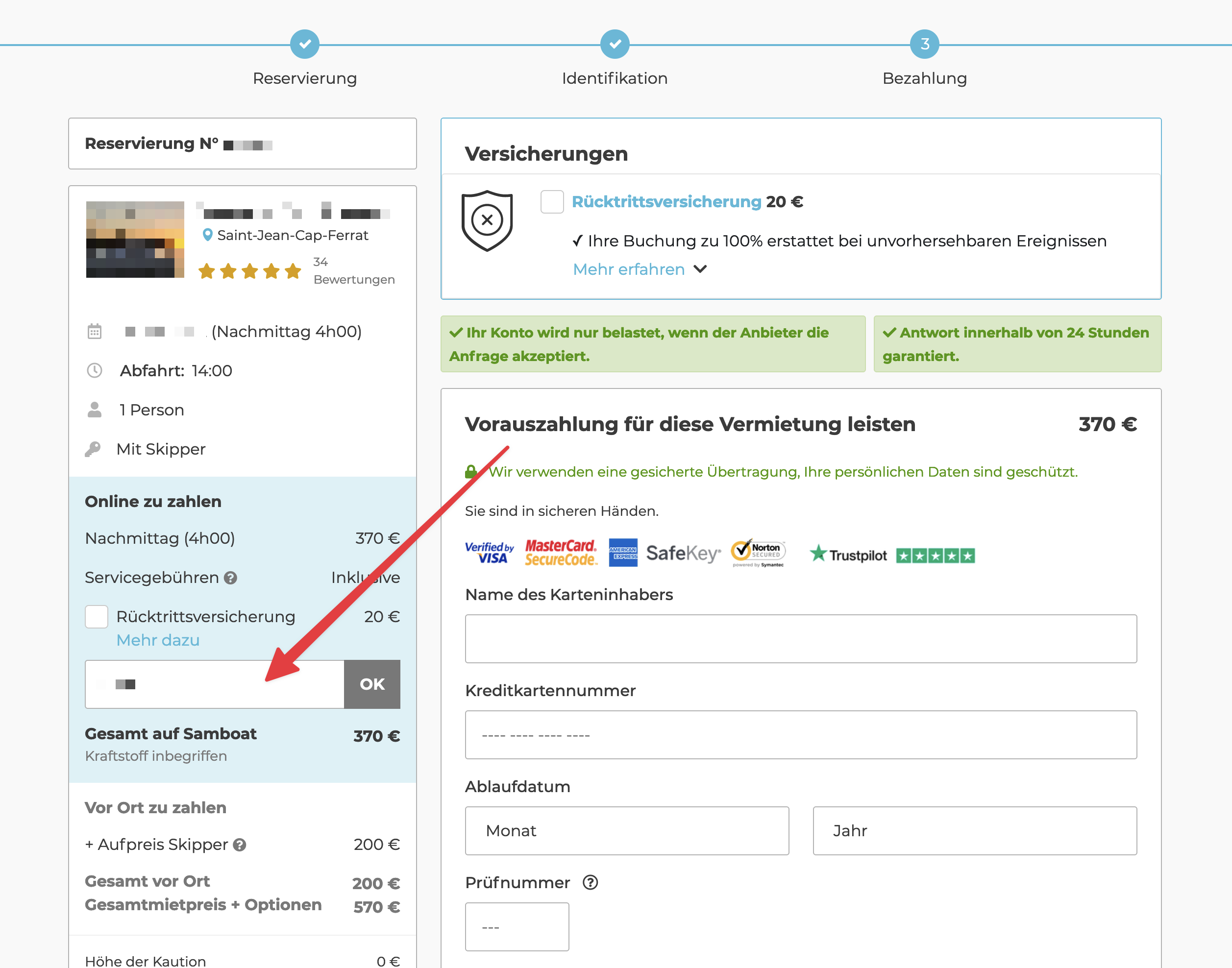Einen Gutscheincode könnt ihr bei SamBoat im 3. Schritt der Buchung Bezahlung einlösen. Klickt dafür auf Fügen Sie einen Rabattcode hinzu und gebt den Gutschein ein:
