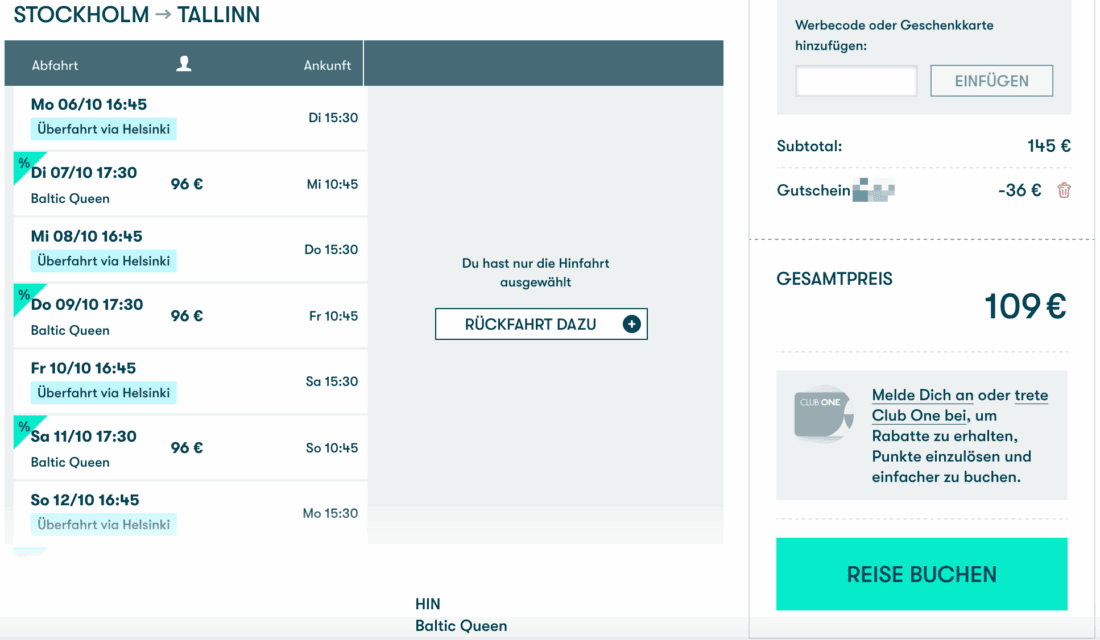 Mit dem Gutschein gibt es u.a. eine Überfahrt von Stockholm nach Helsinki ab 81€ statt 111€ inklusive Innenkabine (für eine Person). Für eine Überfahrt von Stockholm nach Tallinn zahlt ihr dank Gutschein aktuell nur 96€ statt 132€ für eine Person in der günstigsten Innenkabine. Bei zwei Personen werden für eine Doppelbelegung in der Innenkabine 109€ fällig: