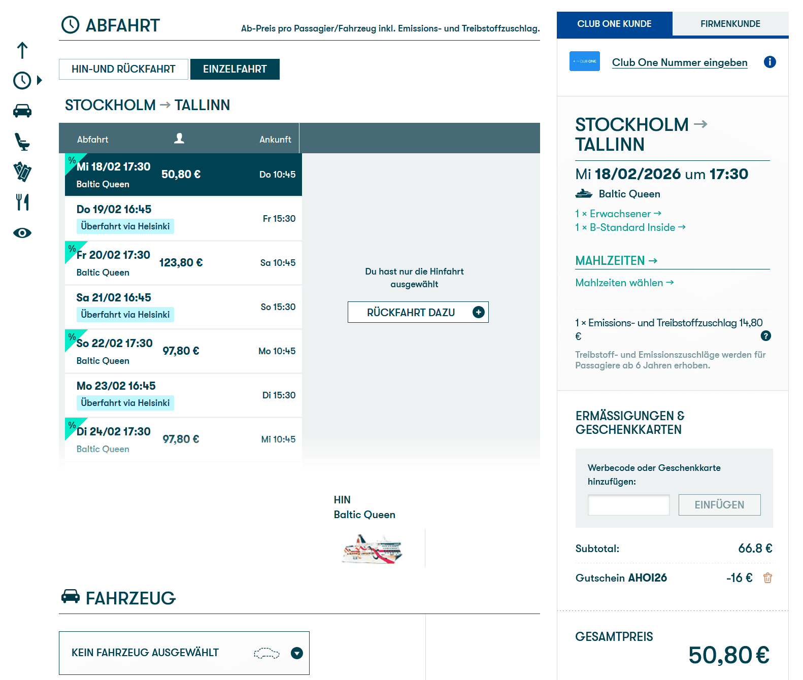 Mit dem Gutschein gibt es u.a. eine Überfahrt von Stockholm nach Helsinki ab 82€ statt 112€ inklusive Innenkabine (für eine Person). Für eine Überfahrt von Tallinn nach Helsinki zahlt ihr dank Gutschein aktuell nur 33€ statt 41€ für eine Person in der günstigsten Innenkabine.