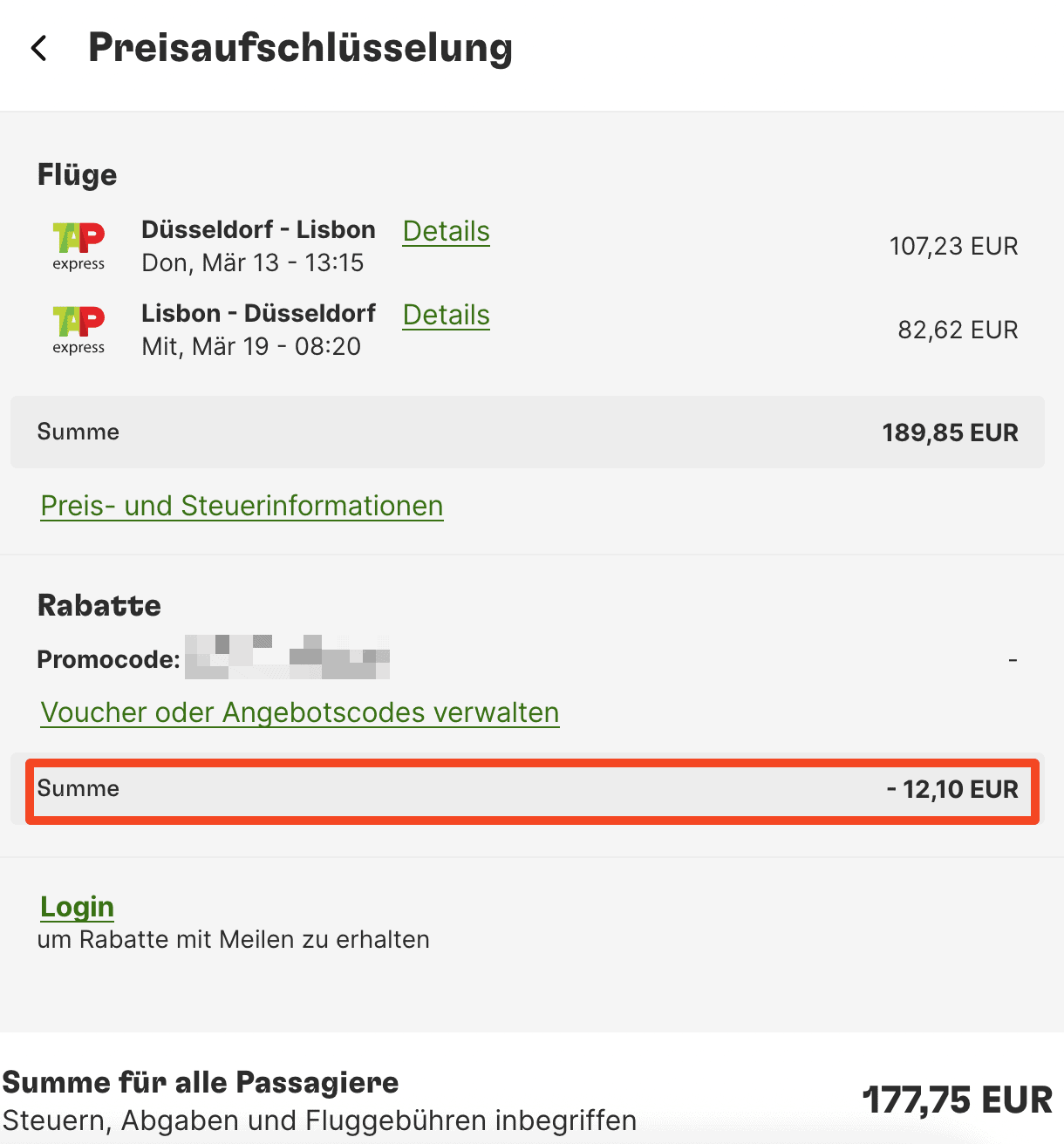 Bucht man über die portugiesische TAP Seite bekommt man die Flüge günstiger als mit diesem 10% Rabatt. Da eine Verwaltungsgebühr über die dt.Seite anfällt. Die 10% sind Augenwischerei. Das war auch bei den 500 Extra Miles genau so. Die werden zwar zum Geburtstagsmonat des flytap Mitglieds ausgewiesen,aber sie werden nie gutgeschrieben. TAP ist was ganz spezielles.