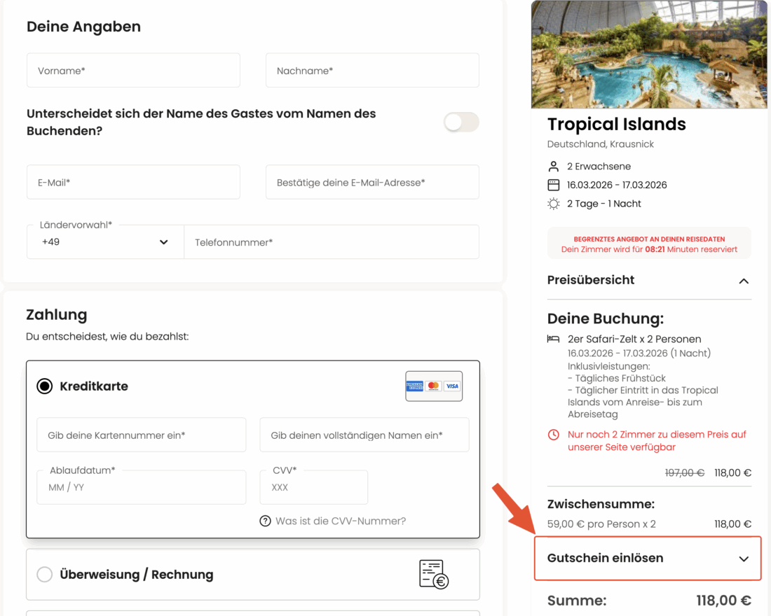Einen Gutschein könnt ihr direkt im Buchungsprozess nach Auswahl der gewünschten Reisedaten und der Auswahl des Hotels einlösen: