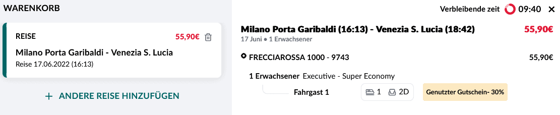 Bei der Buchung solltet ihr beachten, dass Super-Economy-Tickets standardmäßig nicht stornierbar sind und sich auch nicht umbuchen lassen. Die gleichen Konditionen gelten für das Angebot Speciale Frecce bzw. FrecciaDAYS. Gegen einen Aufpreis von 2€ lässt sich aber auch dort eine Storno-Option hinzufügen.
